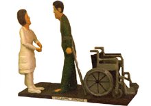 he is now able to walk with crutches, while a nurse is standing by encouraging