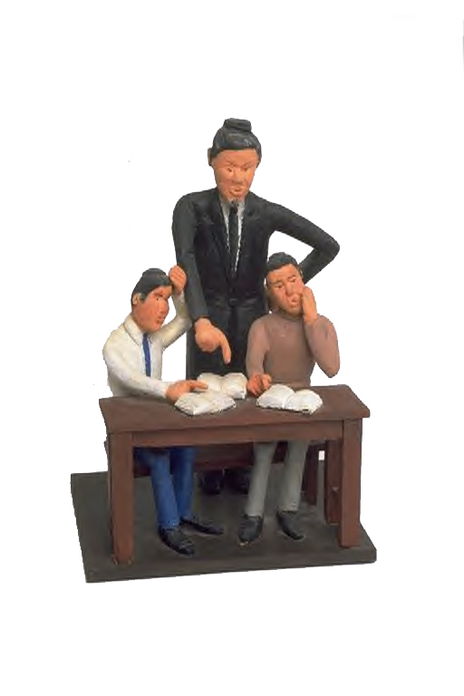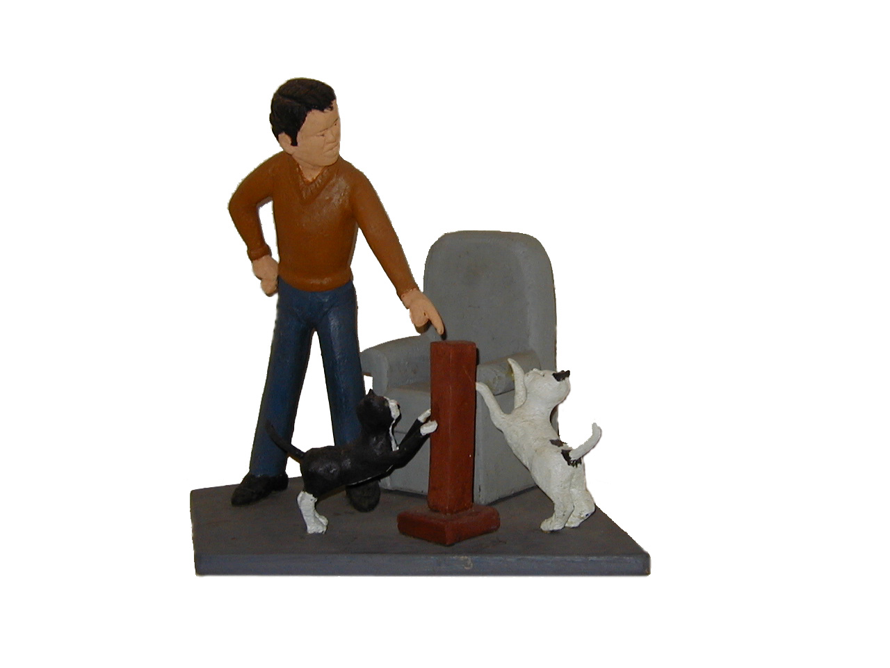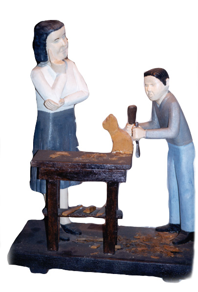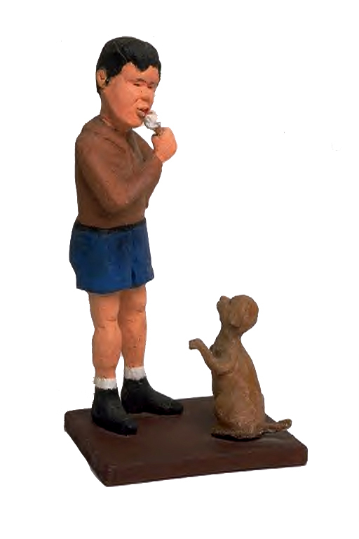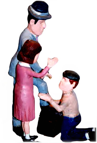 on the shoeshine box. He is flirting with the little girl and is distracted